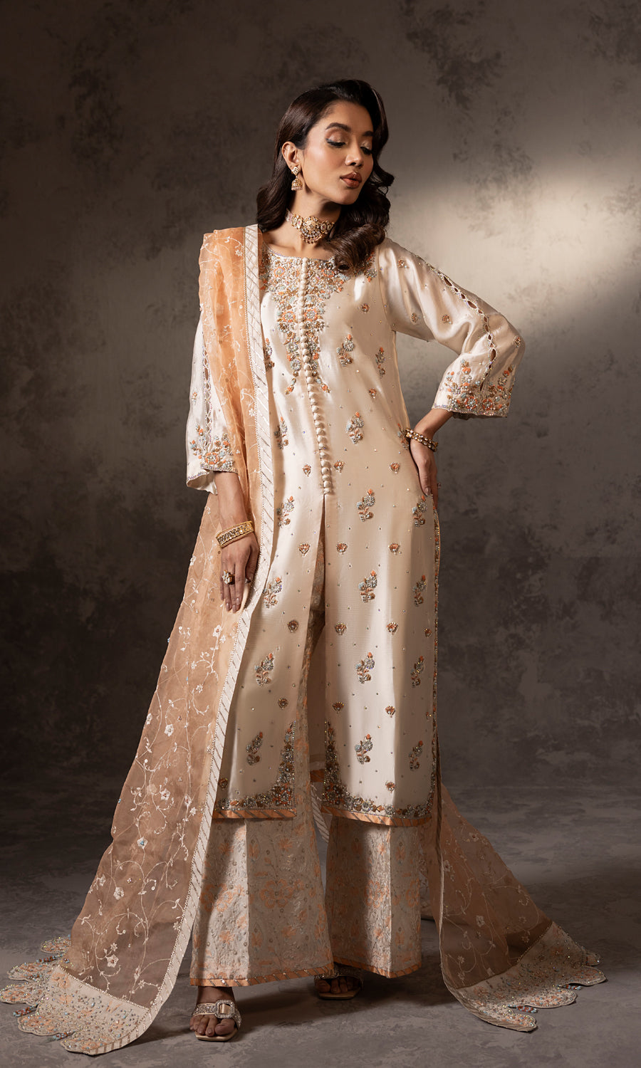 Details: An Ivory shirt with ornate all over embellishment, with hues of Resham and zardozi all over the panels, sleeves, bodice and neckline. It comes with a specially designed by SHAMOOZ along with organza dupatta with beautiful handmade motifs on the 'pallu' and an intricate hand worked border on the front side to add further luxe. it comes with a rich plazo with emboidery work to add richness. The perfect outfit for a grand statement.