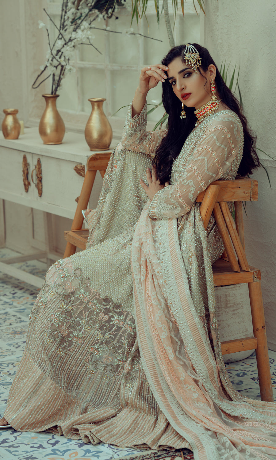Details: An embellished floor length featuring a meticulous floral embellished crystal belt is teamed with pale pink adding contemporary allure to the look. A dainty work of kora dabka spread adorn the top while a pretty cascades on the side.