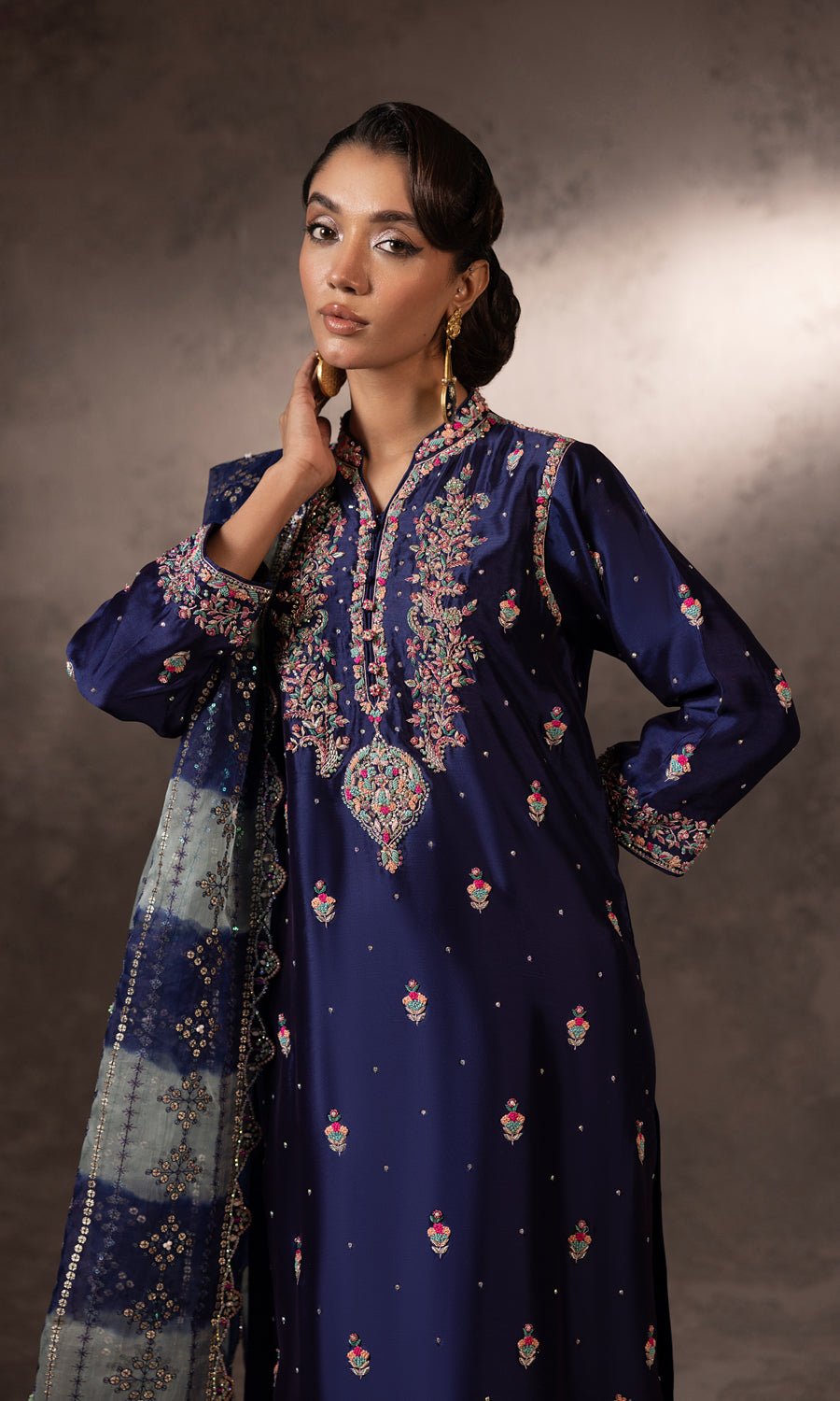 Details: An Blue Shirt with ornate all over embellishment, with hues of Resham and zardozi all over the panels, sleeves, bodice and neckline. It comes with a specially designed by SHAMOOZ along with organza dupatta with beautiful handmade motifs on the 'pallu' and an intricate hand worked border on the front side to add further luxe. it comes with a rich plazo with emboidery work to add richness. The perfect outfit for a grand statement.