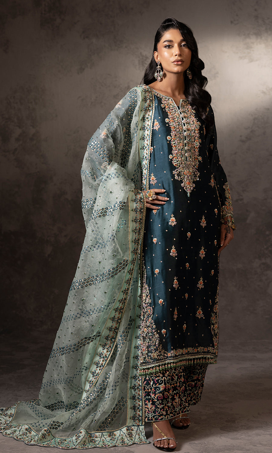 Details: A Teal Shirt with ornate all over embellishment, with hues of Resham and zardozi all over the panels, sleeves, bodice and neckline. It comes with a specially designed by SHAMOOZ along with organza dupatta with beautiful handmade motifs on the 'pallu' and an intricate hand worked border on the front side to add further luxe. it comes with a rich plazo with emboidery work to add richness. The perfect outfit for a grand statement.